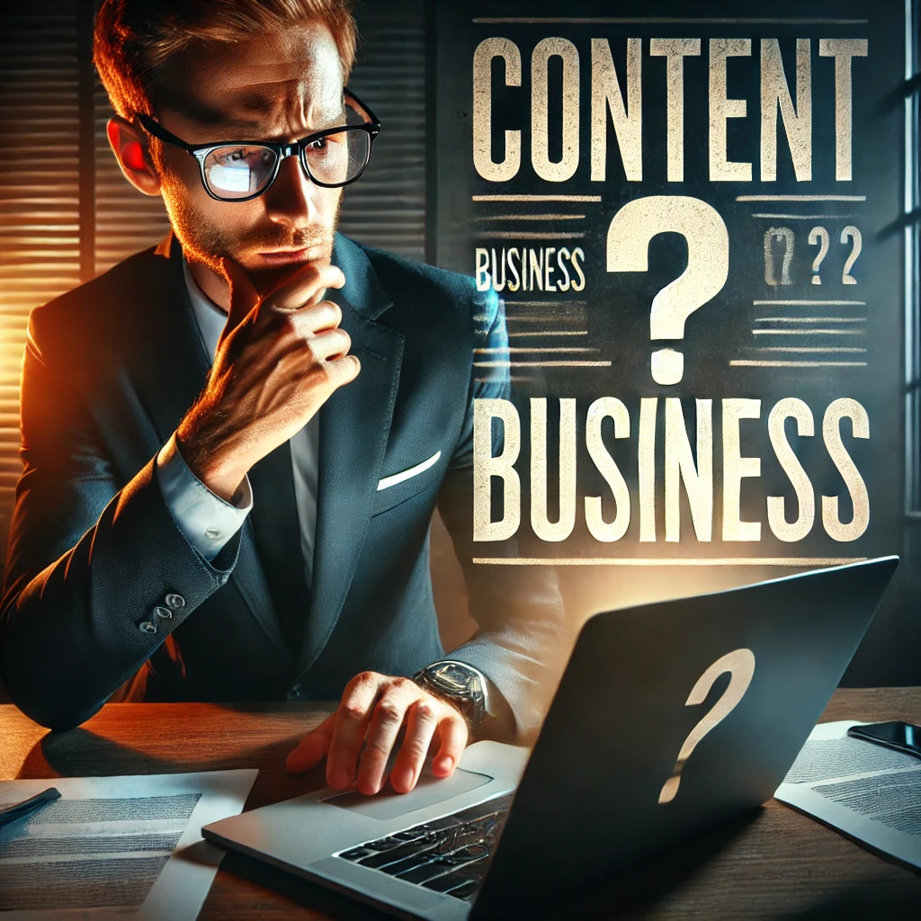 DALL·E 2025-02-15 12.12.05 - A skeptical businessman in a suit looking at a laptop screen with a puzzled expression. The screen displays the words 'Content Business' in bold, with